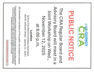 The Quincy Community Redevelopment Agency (Quincy C.R.A.) was created on December 8, 1998 by the City of Quincy, Florida, City Ordinances 896 and 982, to help in its redevelopment efforts. The purpose of the Quincy Community Redevelopment Agency is to remove slum and blight by enhancing the tax base and economy of the City within the C.R.A. District. The Quincy Community Redevelopment Agency’s goal is to implement the vision for the City of Quincy through dialogue between its residents, business leaders, community stakeholders and the City Commission.  The Quincy Community Redevelopment Agency’s vision is to create a unique small-town.  Enhancing neighborhoods and creating a vibrant downtown center, while being fiscally responsible and having a diverse population and business community is our mission.