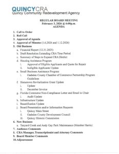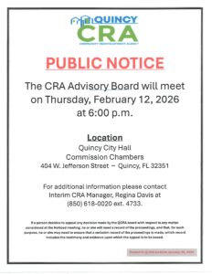 The Quincy Community Redevelopment Agency (Quincy C.R.A.) was created on December 8, 1998 by the City of Quincy, Florida, City Ordinances 896 and 982, to help in its redevelopment efforts. The purpose of the Quincy Community Redevelopment Agency is to remove slum and blight by enhancing the tax base and economy of the City within the C.R.A. District. The Quincy Community Redevelopment Agency’s goal is to implement the vision for the City of Quincy through dialogue between its residents, business leaders, community stakeholders and the City Commission. The Quincy Community Redevelopment Agency’s vision is to create a unique small-town. Enhancing neighborhoods and creating a vibrant downtown center, while being fiscally responsible and having a diverse population and business community is our mission.